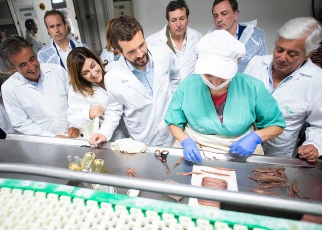 Casado ha aprovechado la visita a la localidad cántabra para recorrer el puerto pesquero, e incluso subirse en uno de los barcos que estaban atracados, y visitar la fábrica de conservas Hoya, donde ha seguido el proceso de elaboración de las anchoas.